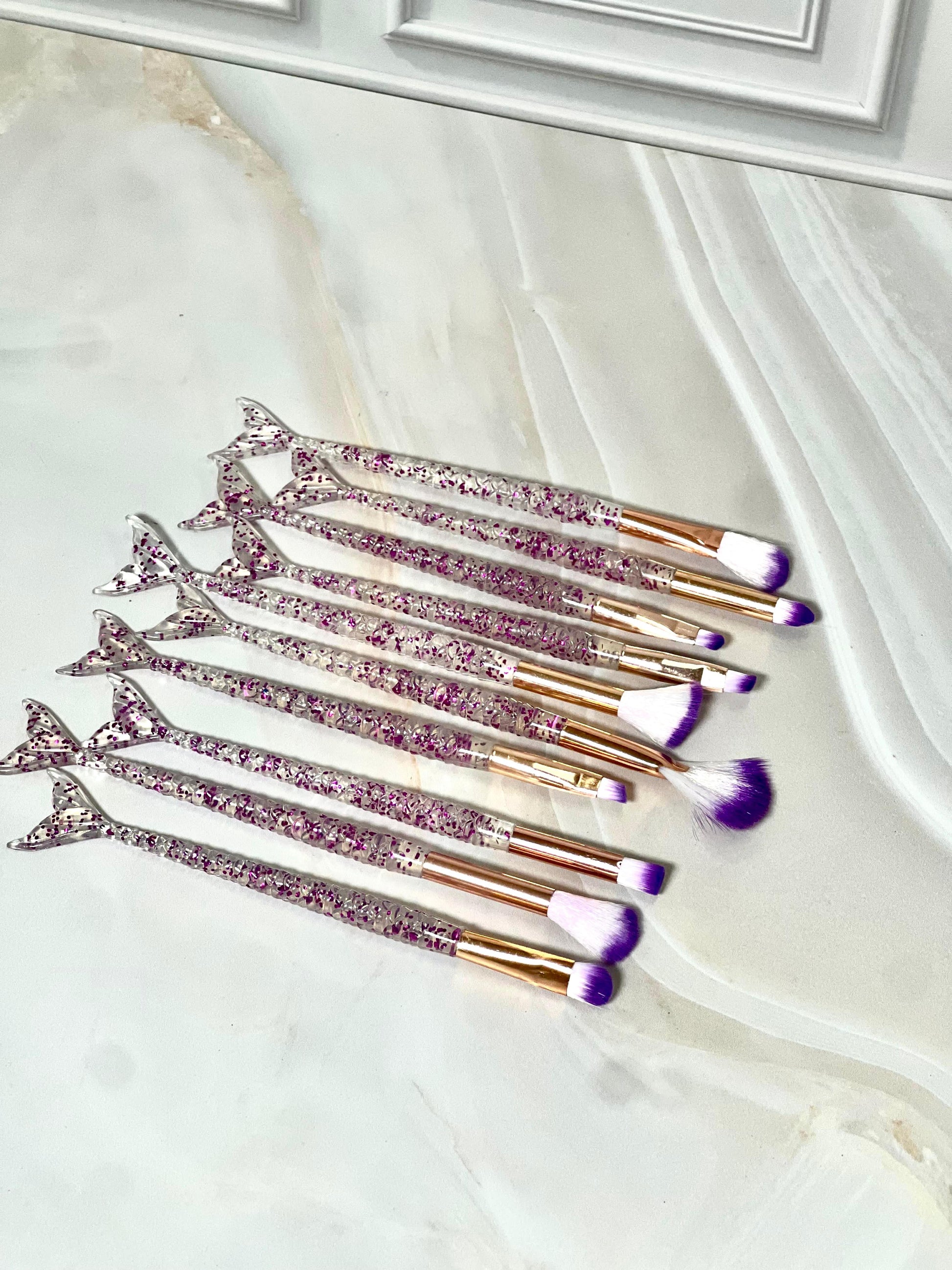 Set de brochas cola de sirena con mango fancy con destellos, estas hermosas brochas vienen en tonos diferentes, pero además de tener un empaque lindo su calidad es perfecta para crear maquillajes impactantes y de buena calidad.