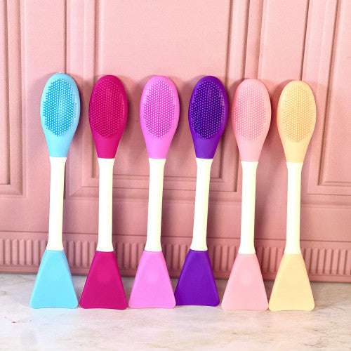 Set de cepillo y aplicador de silicona en colores vibrantes, perfecto para limpieza facial o aplicación de mascarillas y productos líquidos.