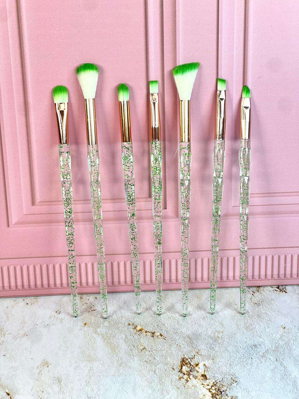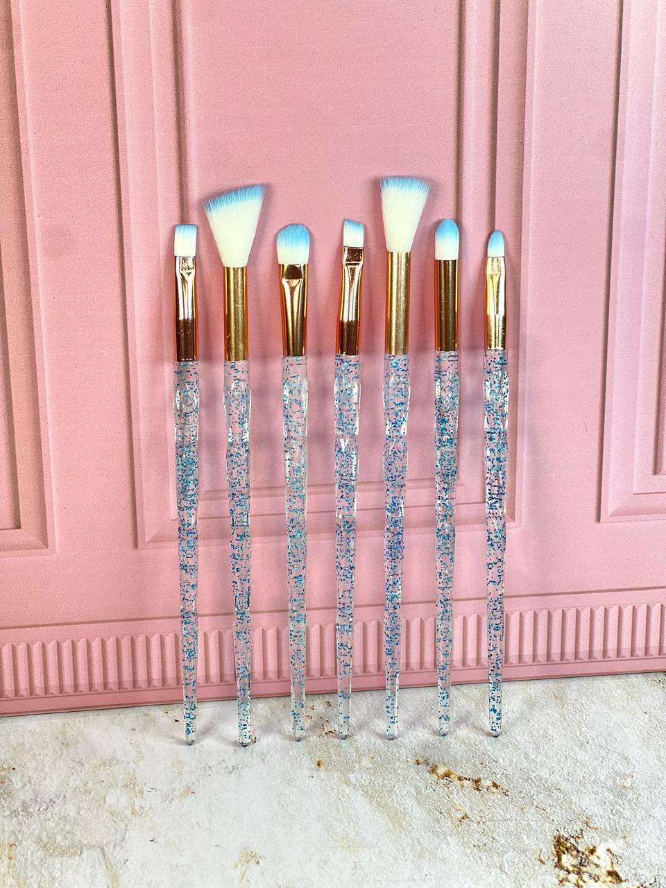 Set completo con mango de diseño acrílico con glitter. Incluye brochas para base, polvo, rubor y ojos.